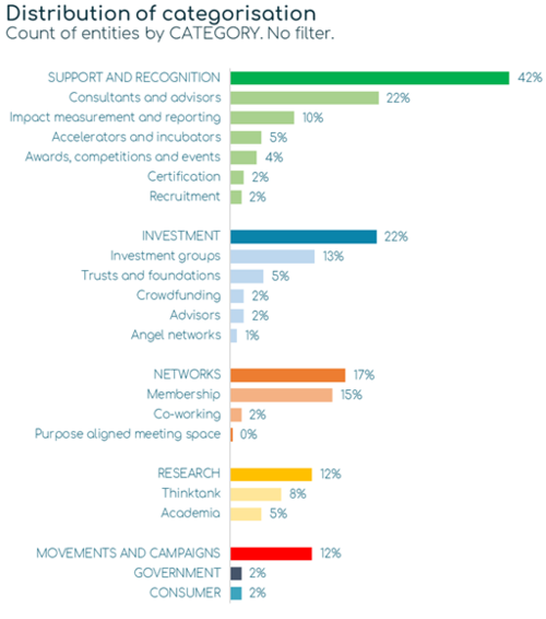 Taxonomy: The ecosystem is the “real world” space where all of the supporting organisations for purpose-driven businesses operate in. We see these categories as essential components for this part of the economy to grow and scale. We defined this space organisations that fall into the following categories and subcategories that we feel are essential for success: